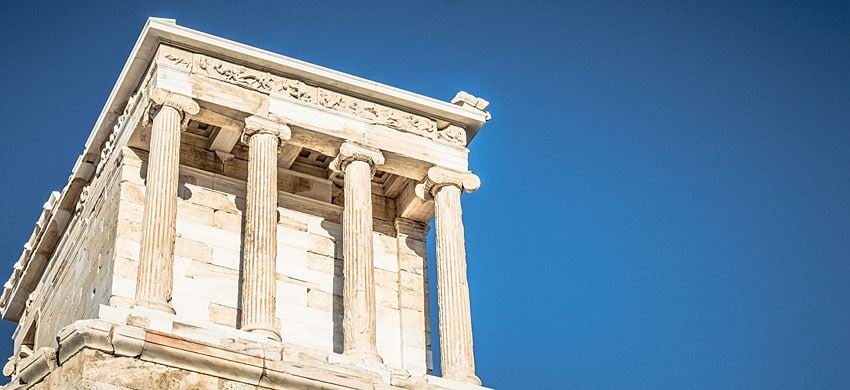 The Temple of Athena Nike, with its 27 meters long and 18 meters wide, is the smallest structure of the Acropolis. Built in 420 BC by the architect Callicrates in honor of the goddess of victory, the temple has a row of 4 monolithic Ionic columns on the front and back.