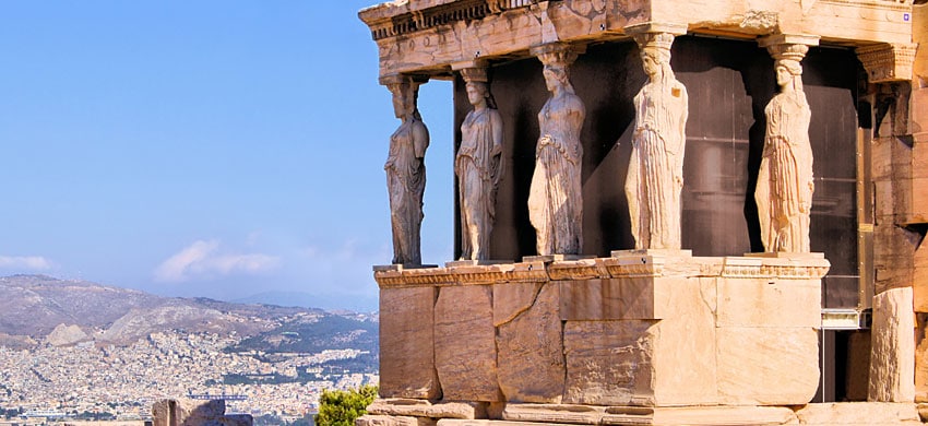 The temple is unusual in that it incorporates two porticos, one to the northwest which is supported by tall Ionic columns, and one at the southwest corner which is supported by 6 female statues about 6 meters high, the famous Caryatids. And just the Caryatids, with their sinuous shape, which seem to support with ease the weight of the entablature on their heads, have become the main feature of the Erechtheion. These female figures are exact replicas of the originals now housed in the Acropolis Museum.