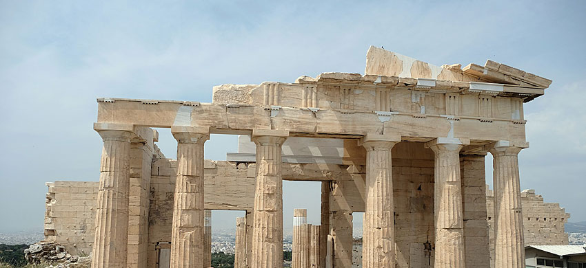 Constructed with the use of white Pantelian marble and grey stone from Eleusis, the Propylaea have a unique appearance and overcome the difficulties of integration both with the different elevations of the site and with the existing architecture.
