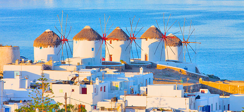 The beauty of these islands has no comparison, the cities, surrounded by the blue waters of the Aegean Sea and warmed by a clear sun, are recognizable by thetraditional architecture dominated by white houses, with blue windows and doors, narrow alleys, small and countless chapels with domed roofs and the famous windmills.