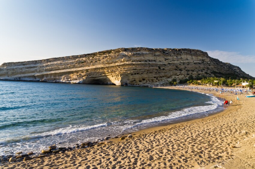 The coastline around Matala offers some of the most beautiful beaches in southern Crete, with a fascinating mix of sandy shores, rocky coves and crystal-clear waters ranging from turquoise to deep blue.