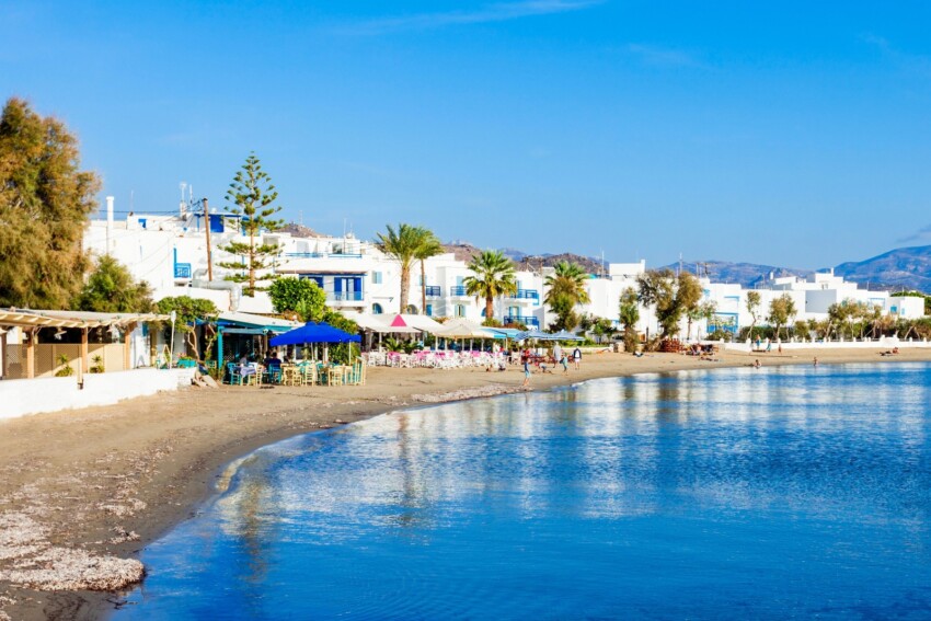 Plaka beach stretches for almost 4 kilometres along the west coast, representing one of the most spectacular sandy shores in the Cyclades. This very long stretch of fine white sand is bathed by crystal-clear waters that slope from turquoise to deep blue, creating a visual effect reminiscent of the Caribbean.