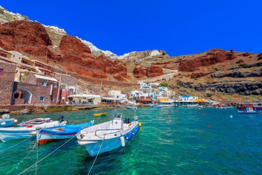 Unlike the large sandy beaches of Santorini, Ammoudi Bay (or Amoudi Bay) is characterised by a small fishing harbour with crystal-clear turquoise waters and volcanic rocks of reddish hues that create a spectacular colour contrast. The bay is only accessible on foot via a steep path down from Oia, making it an oasis of tranquillity despite its proximity to one of the most visited villages on the island.