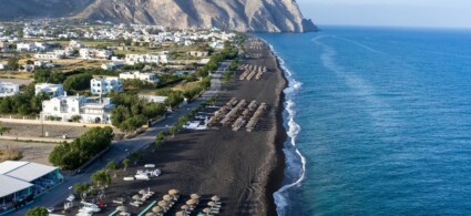 Perissa Beach, famous for its distinctive black volcanic sand, is located a few kilometres east of Emporio. This long shoreline is well equipped with bathing establishments, restaurants and bars, and is considered one of the best places on the island for water sports.