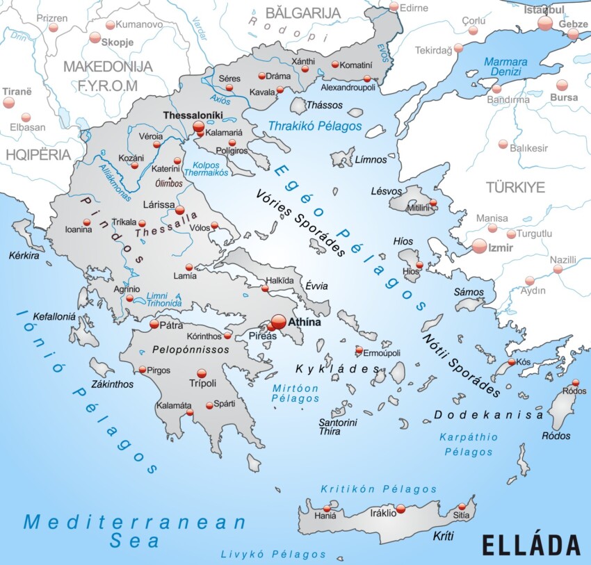 Greece is located in south-eastern Europe and is bordered to the north and north-east by Albania, North Macedonia, Bulgaria and Turkey, while to the south, east and west it has no land borders. There are three seas bordering it: the Aegean Sea, the Ionian Sea and the Sea of Crete.