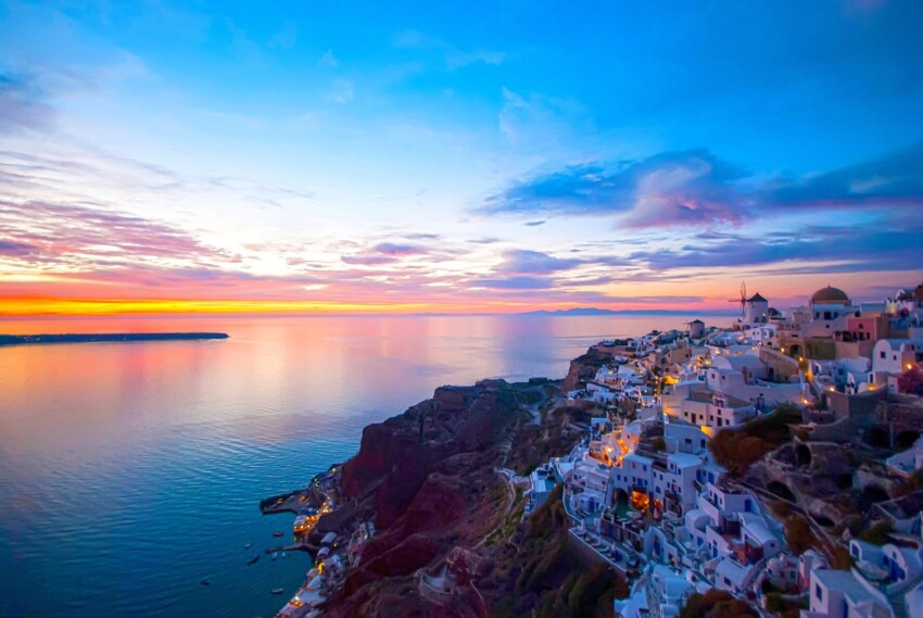 Les couchers de soleil à Oia sont considérés parmi les plus beaux du monde, une expérience mystique qui attire chaque soir des centaines de visiteurs. Quand le soleil commence sa descente vers l’horizon, l’atmosphère du village se transforme : une lumière dorée enveloppe les maisons blanches, les dômes bleus semblent briller encore plus intensément et la mer de la caldeira se tinte de mille nuances.