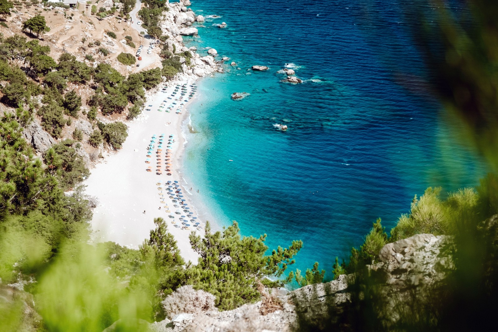 L’accès à Apella emprunte une route panoramique qui serpente à travers les montagnes, offrant pendant le trajet des vues spectaculaires sur la côte orientale de l’île. Une fois arrivé à la plage, le spectacle qui s’offre est inoubliable : des eaux cristallines qui virent du turquoise au bleu intense, entourées de formations rocheuses et de pins parasols. La plage dispose de services organisés avec des tavernes proposant des spécialités locales et une vue privilégiée sur la baie.