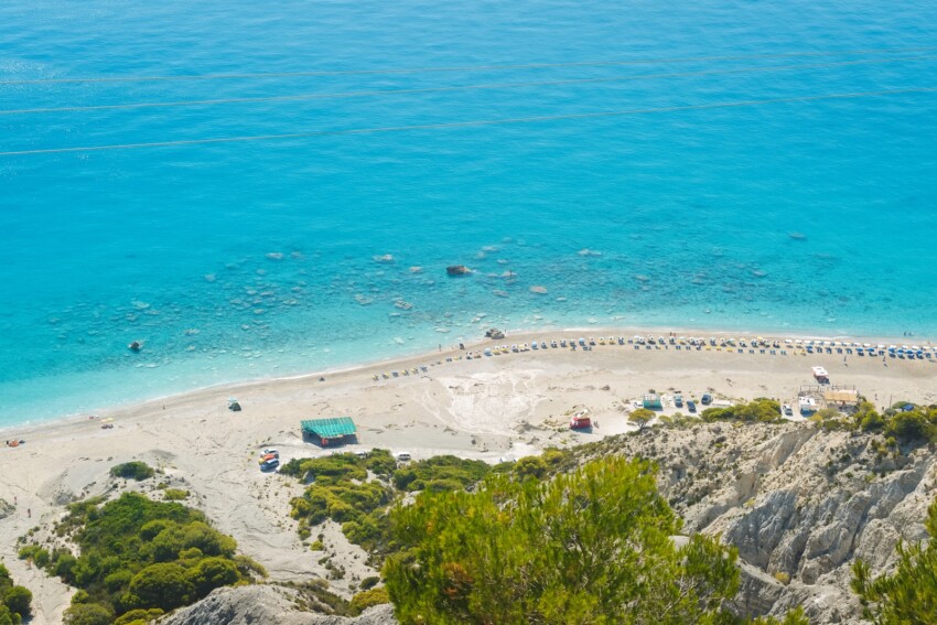 L’accès se fait par un escalier d’environ 100 marches creusé dans la roche, qui offre des panoramas spectaculaires lors de la descente. Le parking se trouve au sommet de la falaise et est payant en haute saison (10 euros). La plage propose des services de chaises longues et de parasols, tandis que dans la zone du parking se trouvent des bars et des tavernes. Pour ceux qui préfèrent la rejoindre par voie maritime, des excursions en bateau sont disponibles depuis Nidri et Vassiliki.