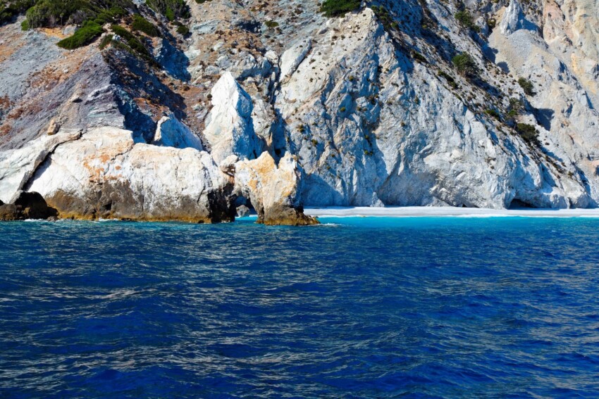Les deux principales grottes sont connues sous le nom de Skotini (Grotte Noire) et Galazia (Grotte Bleue). La première doit son nom à l’atmosphère sombre et mystérieuse créée par son entrée étroite et basse, où seule une petite embarcation peut passer à la fois. Malgré son aspect un peu inquiétant, cette caractéristique la rend particulièrement fascinante pour les explorateurs les plus aventureux.