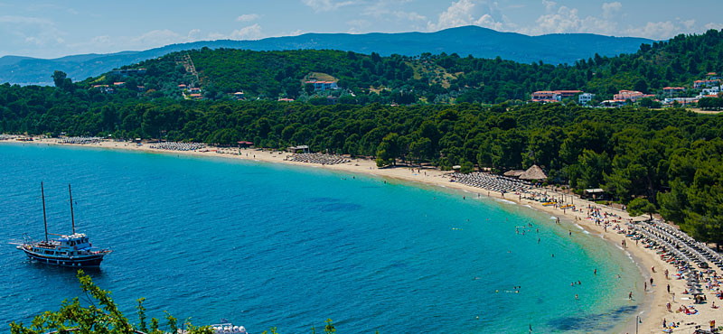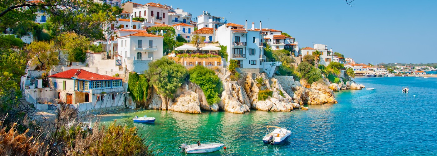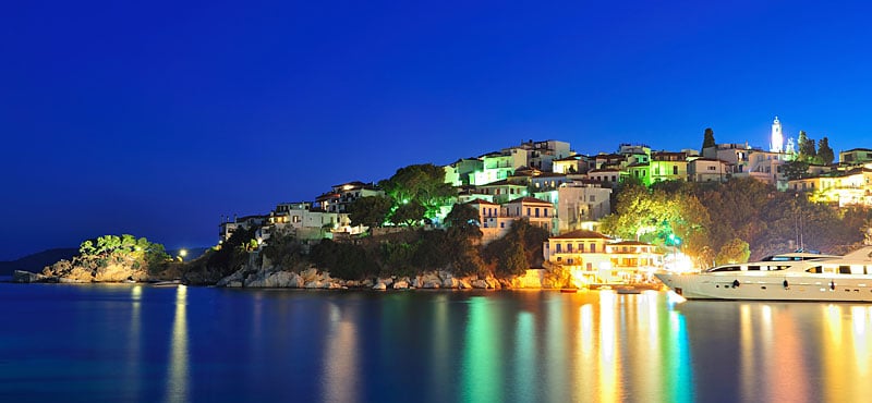 Skiathos is a cosmopolitan, wooded island with beautiful sandy beaches, including the very famous Koukounaries, and attracts many tourists from April to October.